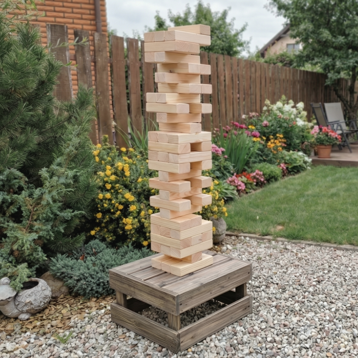 Kaladėlių bokštas puikiai tiks įvairioms progoms – vakarėliams, šeimos susibūrimams ar draugų susitikimams. Žaidimą sudaro 18 aukštų po 3 kaladėles, tad bokšto aukštis siekia net 80 cm, o žaidžiant gali siekti ir iki 2 metrų!